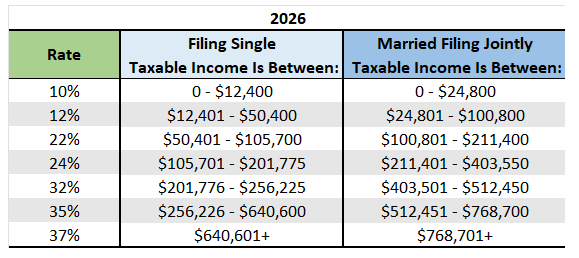 The One Big Beautiful Bill (OBBB) made permanent the federal marginal income tax brackets, that were originally set to revert back 2017 levels starting this year. An extra inflation adjustment applies to the lower two tax brackets which increased by 4% for 2026. The higher brackets increased by 2.3%.
