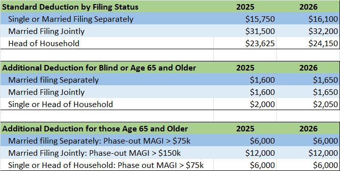 The Standard Deduction for 2025 saw additional increases between $1,150 and $2,300 with the passage of the OBBB. A benefit for 2025 and beyond, with the 2026 inflation adjustments based on the new amounts.