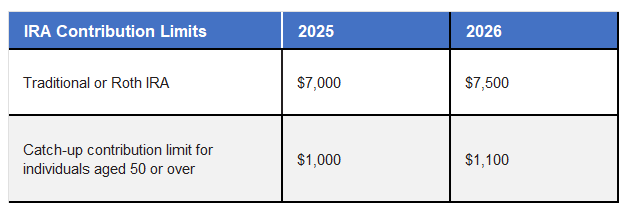 The combined annual contribution limit for traditional and Roth IRAs increased to $7,500 for 2026, with individuals aged 50 or older permitted to make an additional catch-up contribution of $1,100. Under SECURE 2.0, the IRA catch-up contribution is now subject to an annual cost-of-living adjustment, with 2026 marking the first increase.