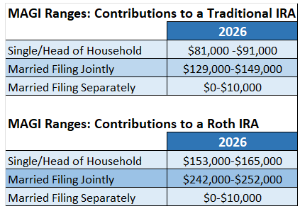 Note: The 2026 phaseout range is $236,000-$246,000 when the individual making the IRA contribution is not covered by a workplace retirement plan but is filing jointly with a spouse who is covered. The phaseout range is $0-$10,000 when the individual is married filing separately and either spouse is covered by a workplace plan.