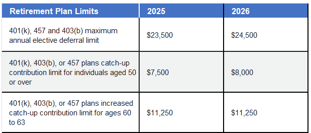 Employees who participate in 401(k), 403(b), and most 457 plans may defer up to $24,500 in compensation in 2026. Employees aged 50 or older can defer up to an additional $8,000 in catch-up contributions. For those aged 60 to 63 the increased contribution limit will remain $11,250.